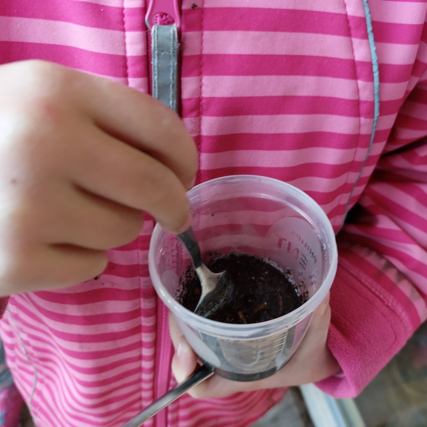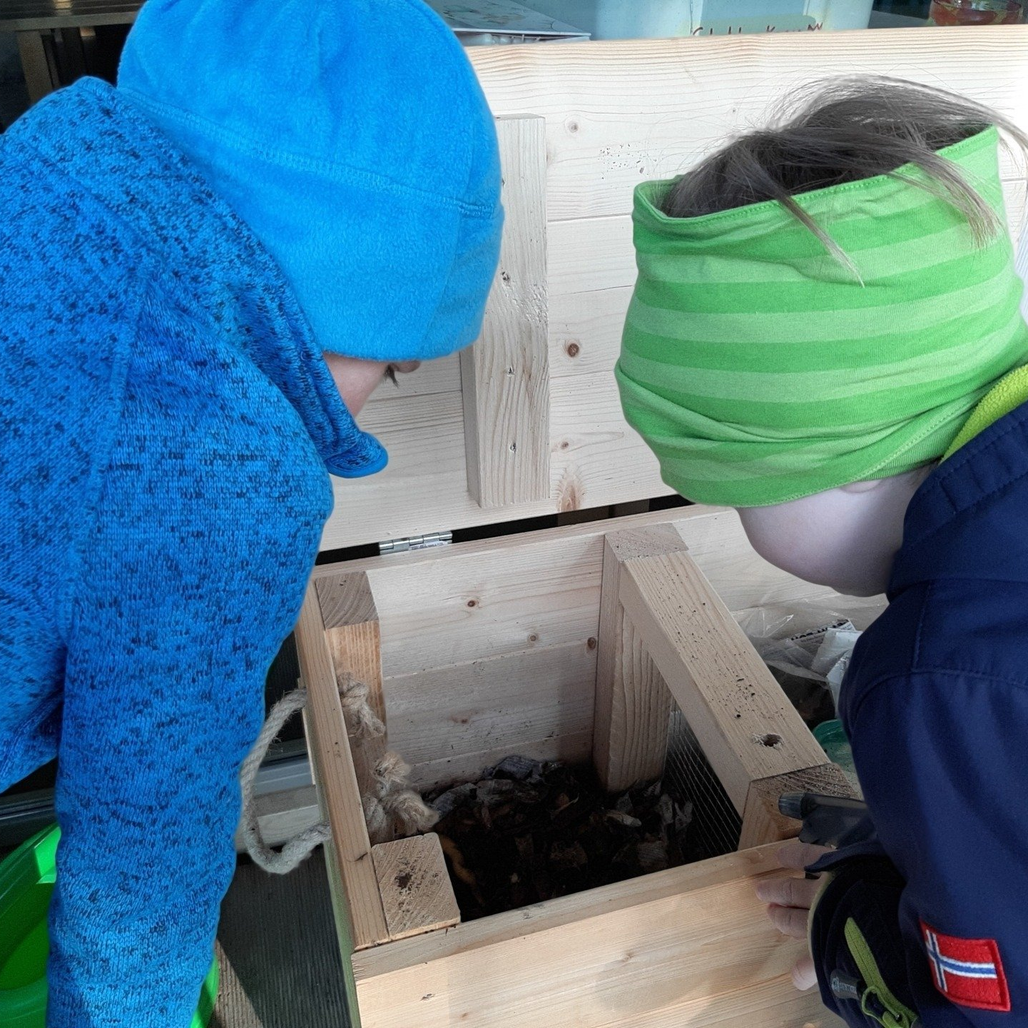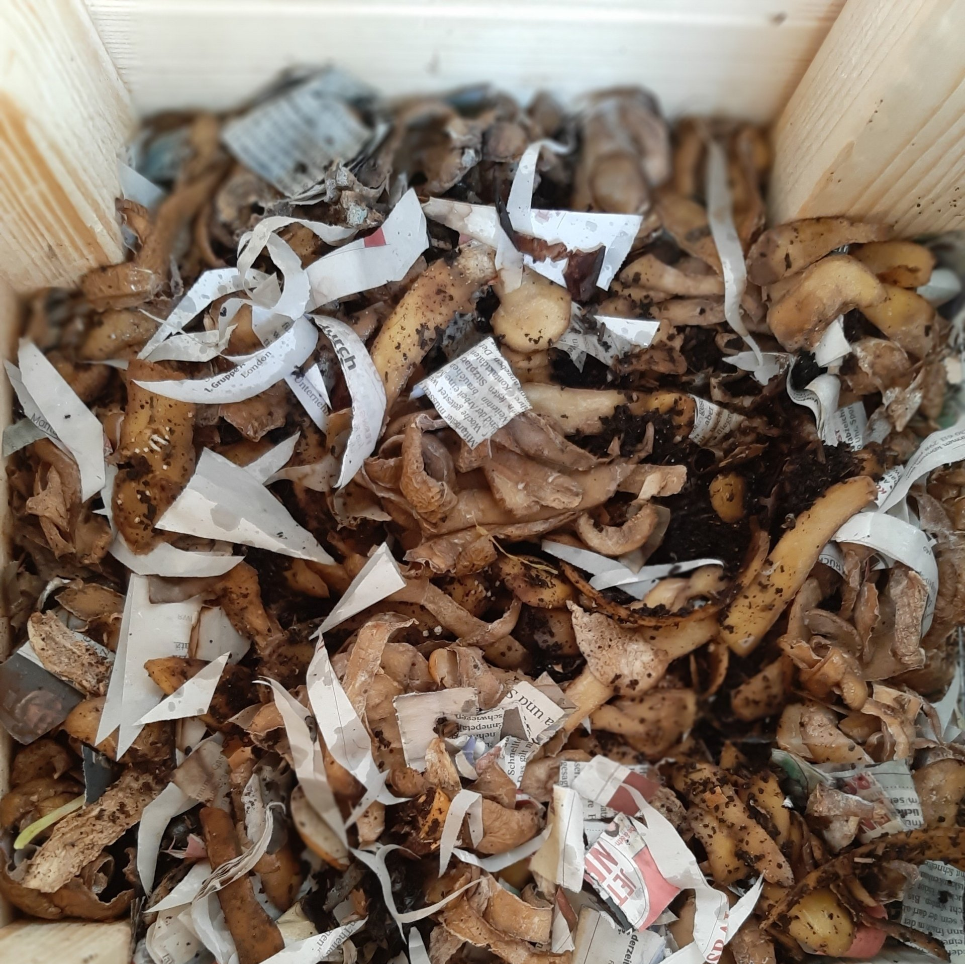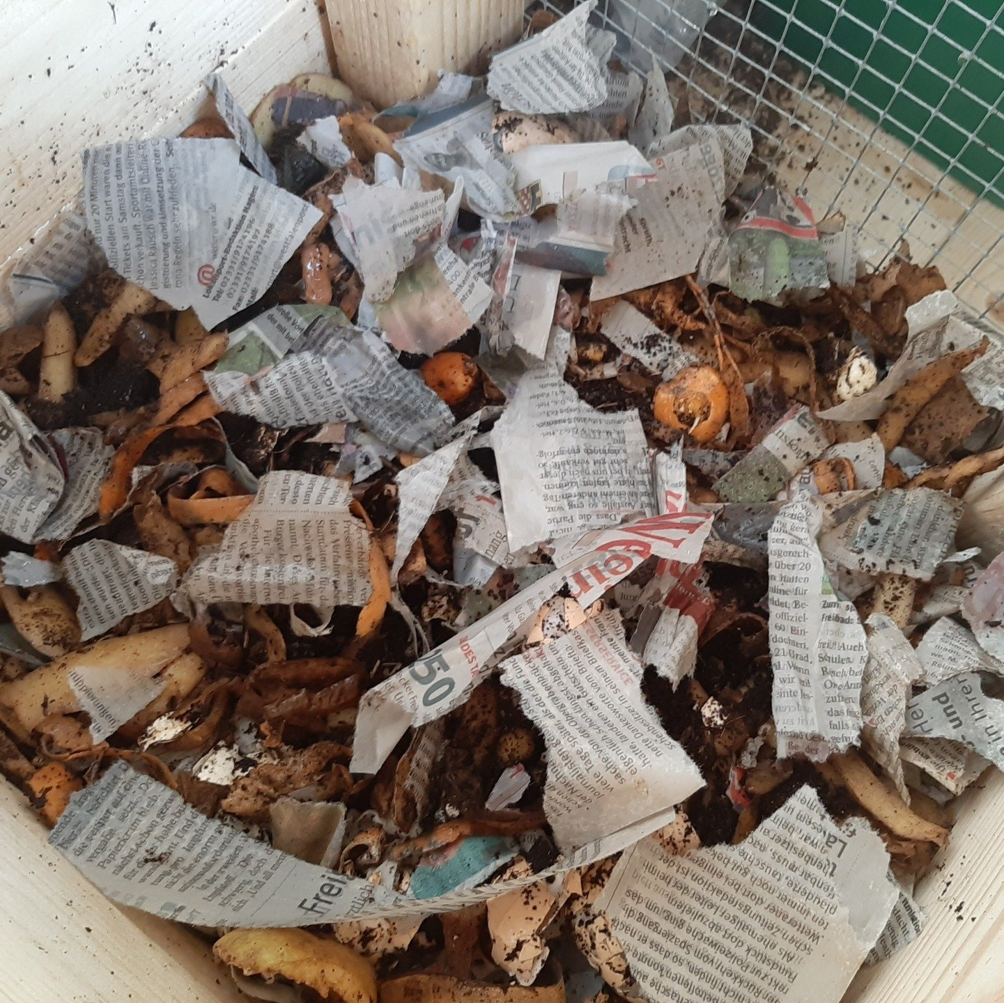 Heute haben die Kinder ihre Würmer mit leckeren Frühstücksresten gefüttert. Kaffeesatz und Apfelschalen sowie Schnipsel der Tageszeitung fanden den Weg in die Kiste.